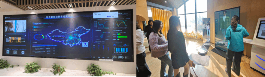 在杜克普服装有限公司工作人员的全程陪同下,师生们开启了深度的智能制造探索之旅。店铺负责人王昭老师首先围绕公司研究成果与整体运营状况展开讲解,通过服装可视化数据大屏,将生产效率、实时来单、区域客户分布、年销售额等核心运营数据直观呈现,让学生们真切感受数据驱动生产、精准对接市场的产业发展趋势,明晰数字化在服装企业运营中的重要作用。作为西北服装智能制造标杆企业,杜克普打造的柔性化定制生产线,实现了从设计到生产全环节的数字化可追踪,其一人一版、一键式的定制模式,更是让学生们感受到智能制造为服装产业带来的变革。