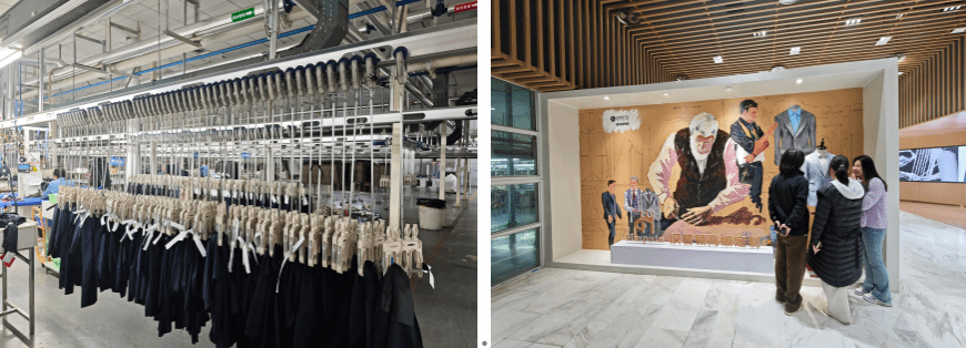 随后,师生们走进技术中心与生产车间,企业赵林静老师围绕生产流程展开专业讲解。从人体数据转化、版型设计,到参数化制版、工艺参数设定,再到产品的生产过程,工作人员逐一说明,详细阐释了参数化制版在提升制版效率、保障版型标准化、适配智能制造生产体系中的重要意义。在生产车间,吊挂系统的高效流转、标准化大烫工序的精细把控、成品质量的严格抽检,全方位展现了智能制造在提升生产效率、保障产品品质上的显著优势,学生们认真观察、积极提问,详细了解每一个智能生产环节的技术要点和操作规范。同时,师生们还深入了解了杜克普高端定制系列汉普顿的品牌定位、设计理念与工艺特色,将品牌打造与智能制造的融合发展理念融入认知。