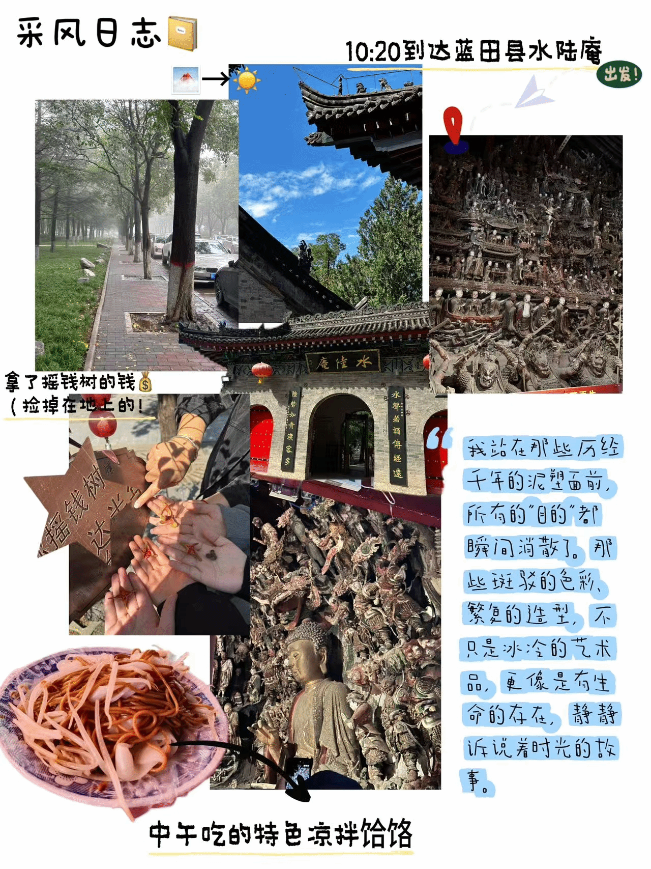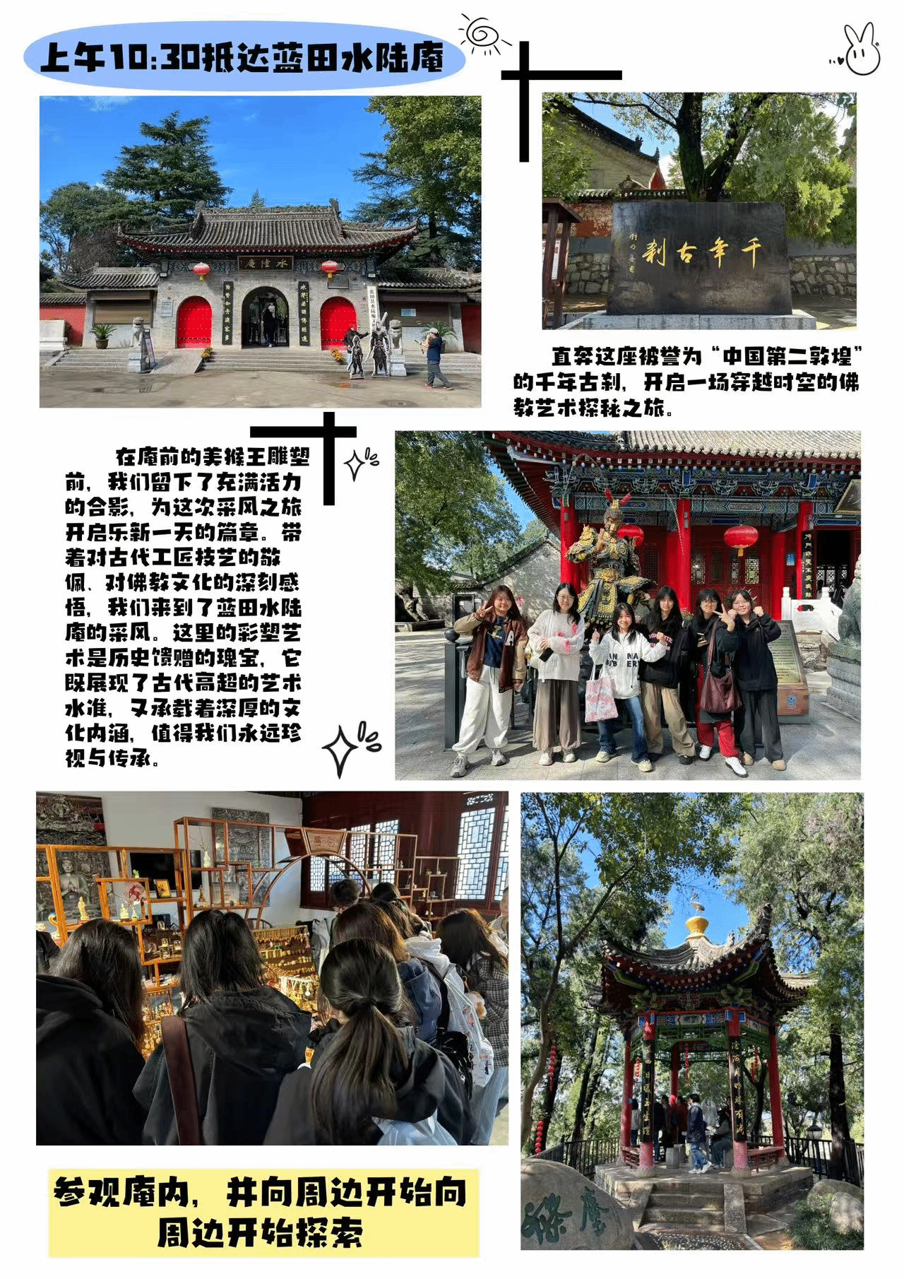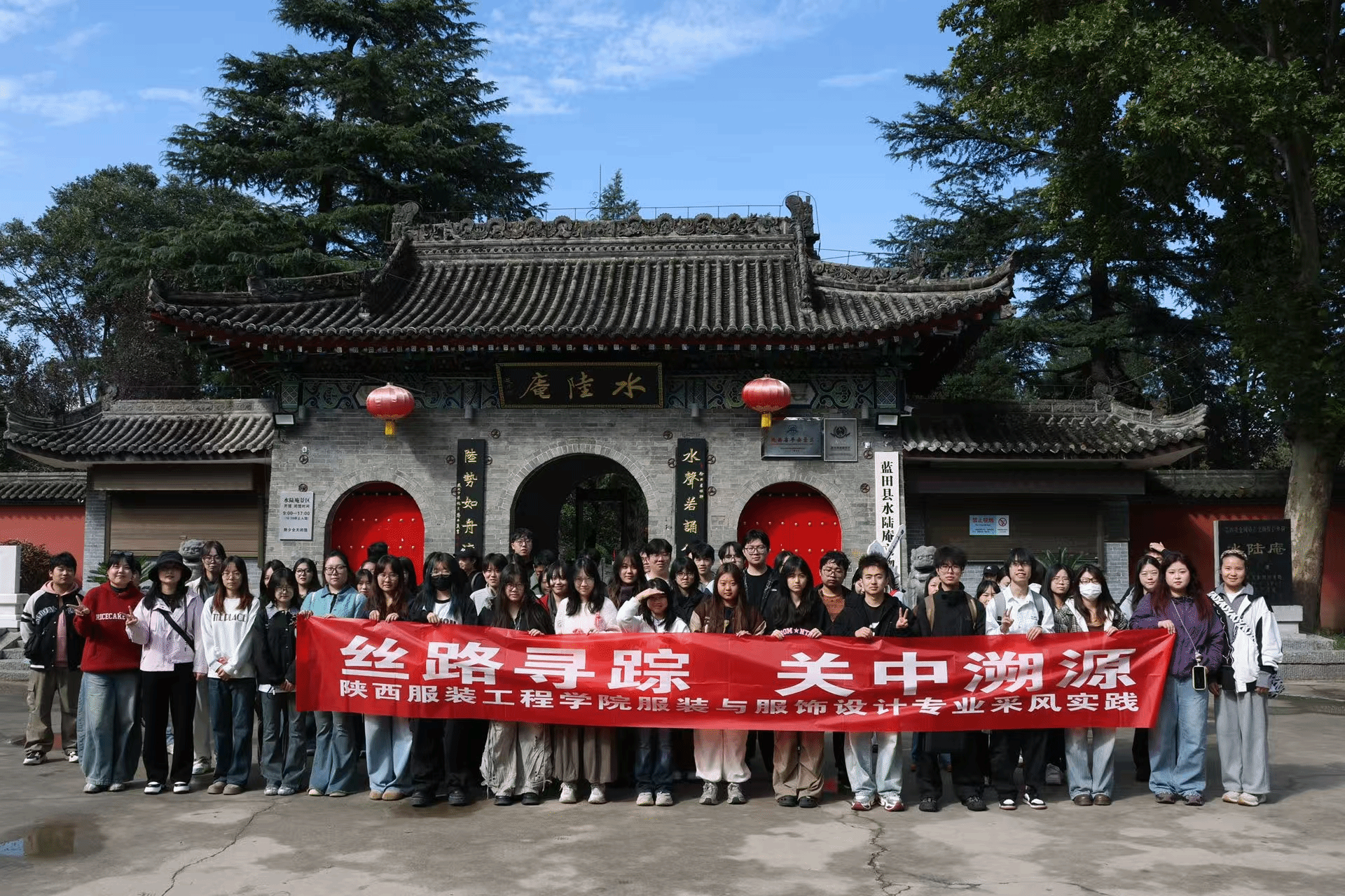 本次采风考察首站选定于丝绸之路重要节点之一——陕西西安蓝田县水陆庵。师生们在校门前怀着兴奋的心情进行集体合照后,统一乘坐大巴抵达这座被誉为“中国第二敦煌”的明代佛教寺院。踏入这座藏于秦岭脚下的古建秘境,殿内栩栩如生的明代彩塑群瞬间吸引了所有人的目光,那些衣袂翩跹的菩萨、铠甲鲜明的天王,其服饰形制、纹样细节与色彩搭配,宛如一部立体的“古代服饰设计图鉴”,让学生直呼“不虚此行”。