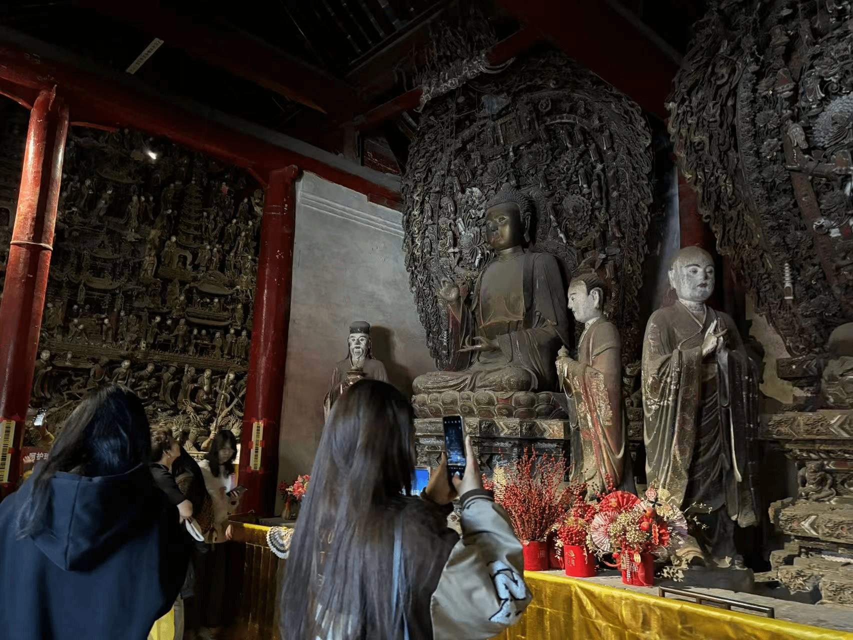 来不及卸下旅途疲惫,学生便迅速拿出相机、速写本与画笔,分散在殿内各处开启素材收集工作。镜头下,有人聚焦彩塑服饰的褶皱肌理,捕捉衣料垂坠的自然弧度;有人对准细节纹样,记录下鱼鳞纹、祥云纹的繁复结构与对称美学。