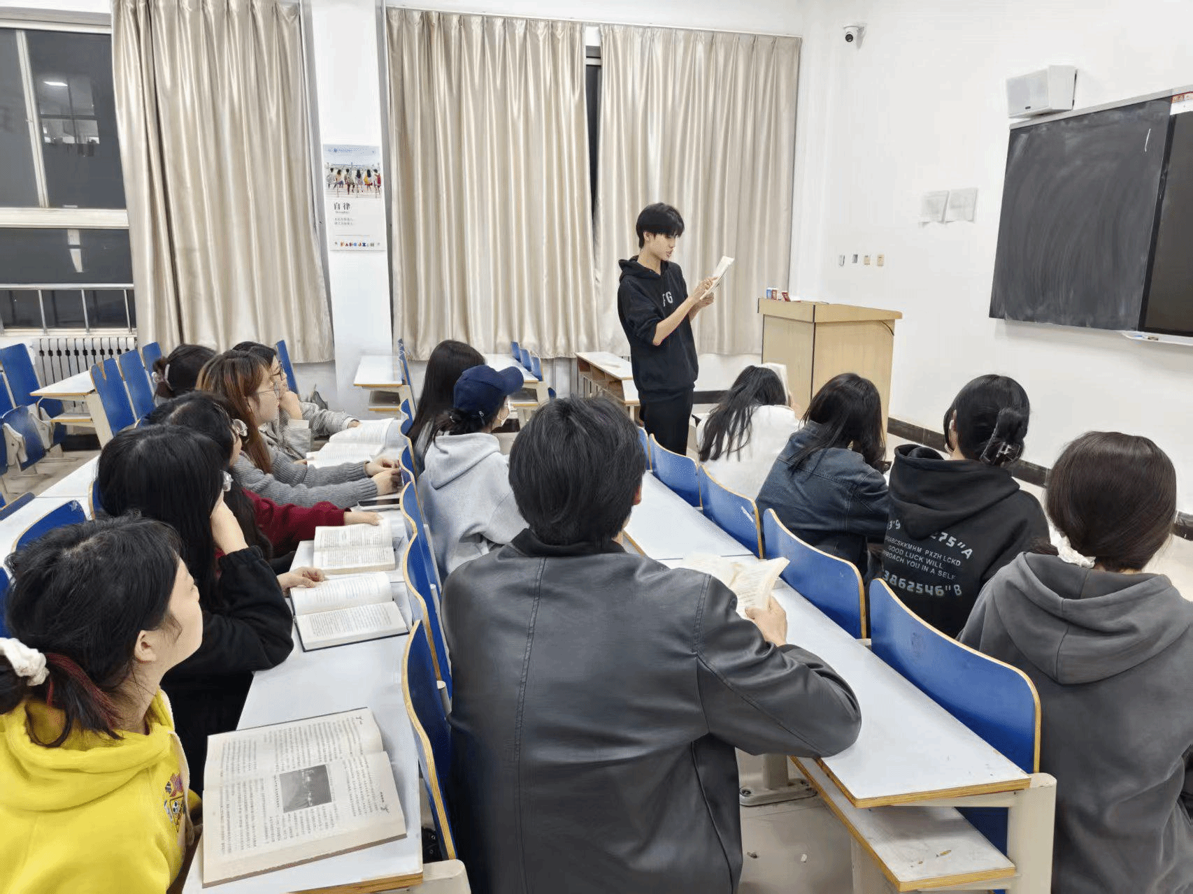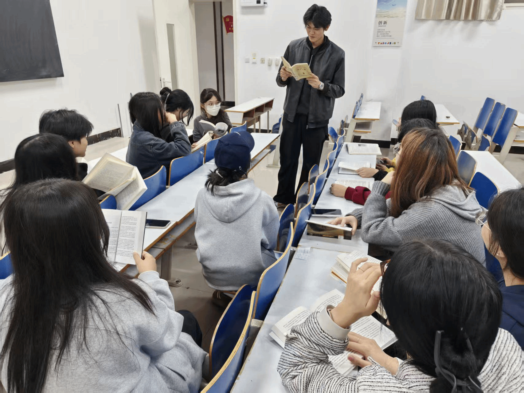 本次读书会以“文学与哲学”为核心主题,前期通过“班级推荐+自主报名”的方式,面向全班征集读书感悟分享者。经过筛选,12位同学脱颖而出,他们带来的书籍涵盖文学经典、社科著作、人物传记等多个领域,从《平凡的世界》到《你当像鸟飞往你的山》,从《社会心理学》到《小王子》等等……每一本好书都承载着独特的思考与感悟。