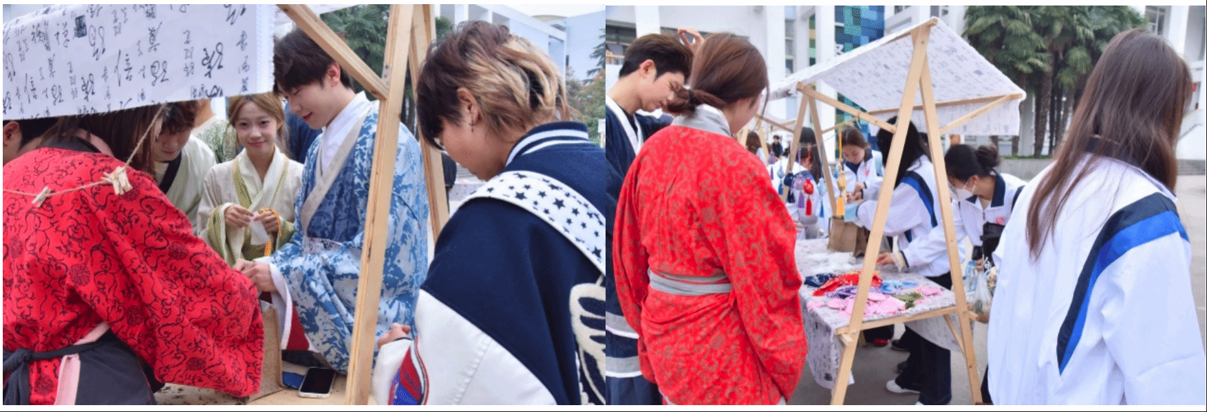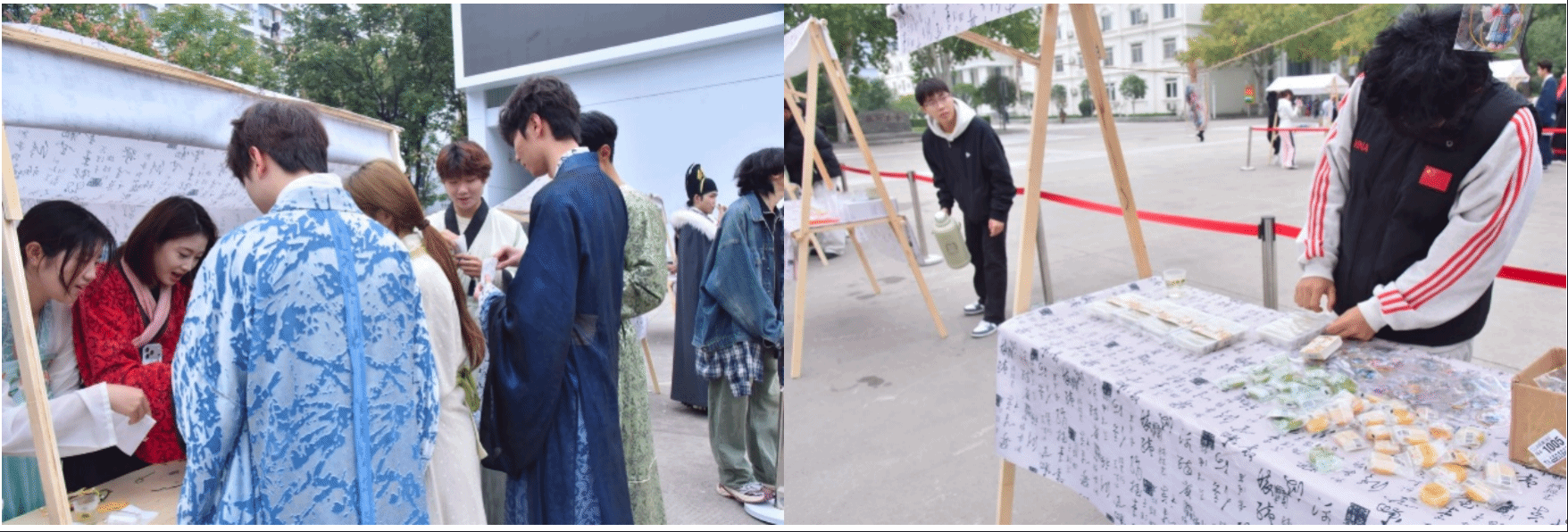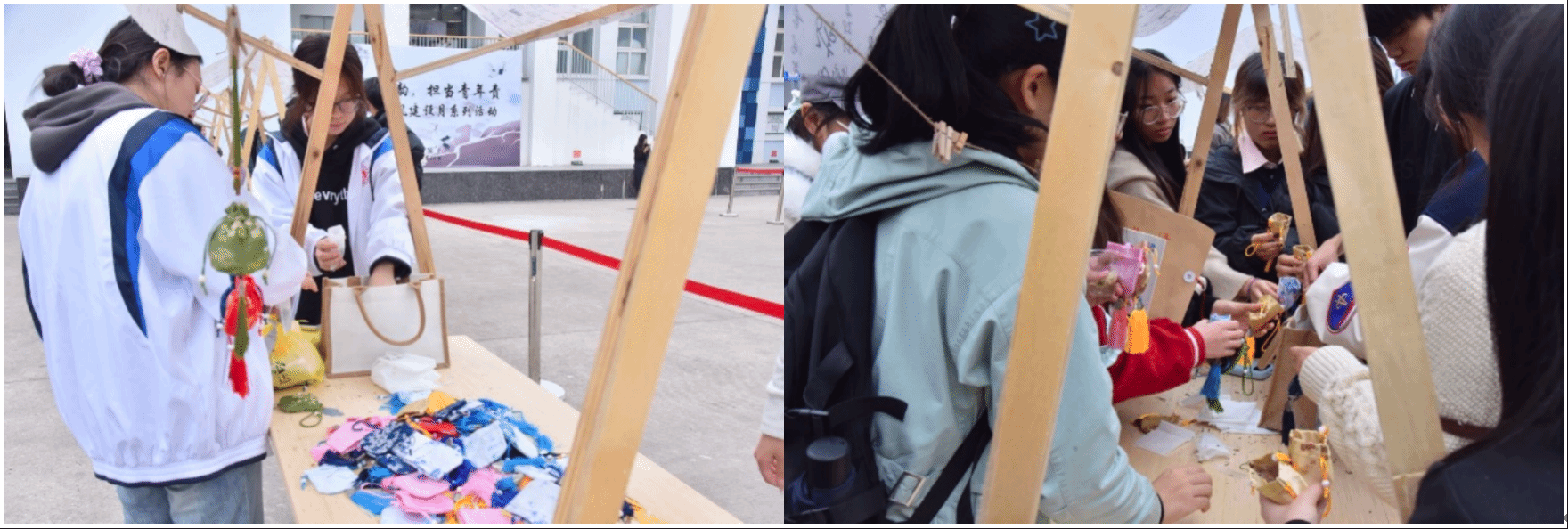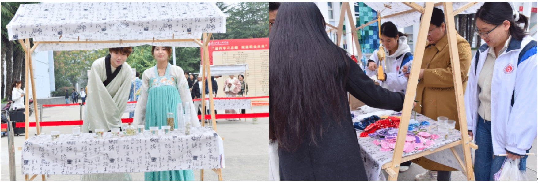 台下的特色小摊同样人气爆棚,各类体验项目趣味十足。“重阳主题手作摊”前,学生们专注地制作茱萸香囊、菊花纹样书签、传统盘扣饰品,将专业技能融入民俗手作,在实操中锤炼动手能力;“服饰搭配咨询摊”上,学子们发挥专业所长,为师生提供传统服饰穿搭建议,分享重阳服饰礼仪小知识,在交流互动中夯实专业认知、传递文化魅力,让勤学善用的学风氛围浸润现场每一处。