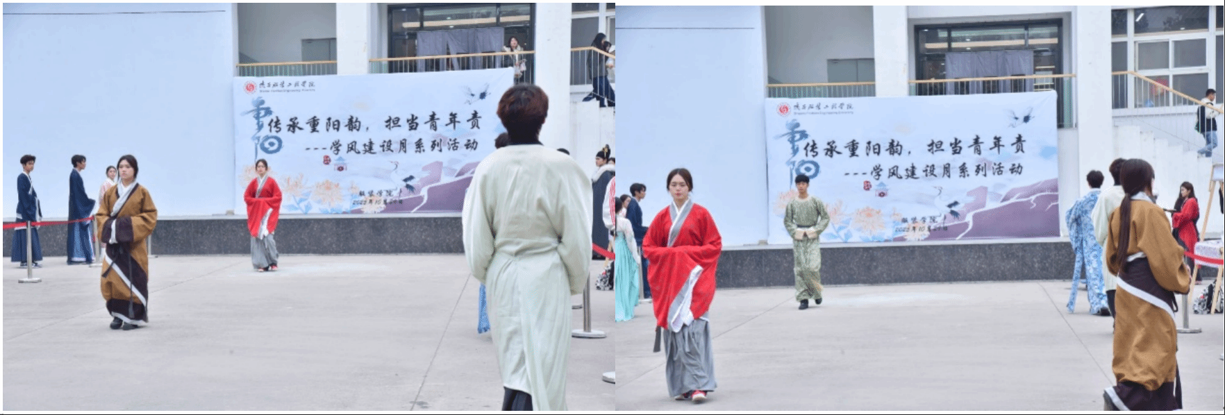 活动现场,汉服走秀与舞蹈表演接连上演,成为视觉焦点。身着融入重阳元素的传统服饰的学子们依次登台,宽袍大袖间点缀着茱萸纹样、菊花刺绣,裙摆流转间尽显古韵风华;模特们迈着从容的步伐,将汉服的飘逸雅致与重阳文化的温情意蕴完美融合。随后,舞蹈演员们身着素雅服饰登场,灵动的舞姿搭配悠扬的音乐,举手投足间满是古典韵味,让观众在沉浸式体验中领略传统服饰之美与古典舞蹈之韵,感受“敬老爱老”的文化内涵,更激发了学子们对传统元素与专业设计结合的探索热情。