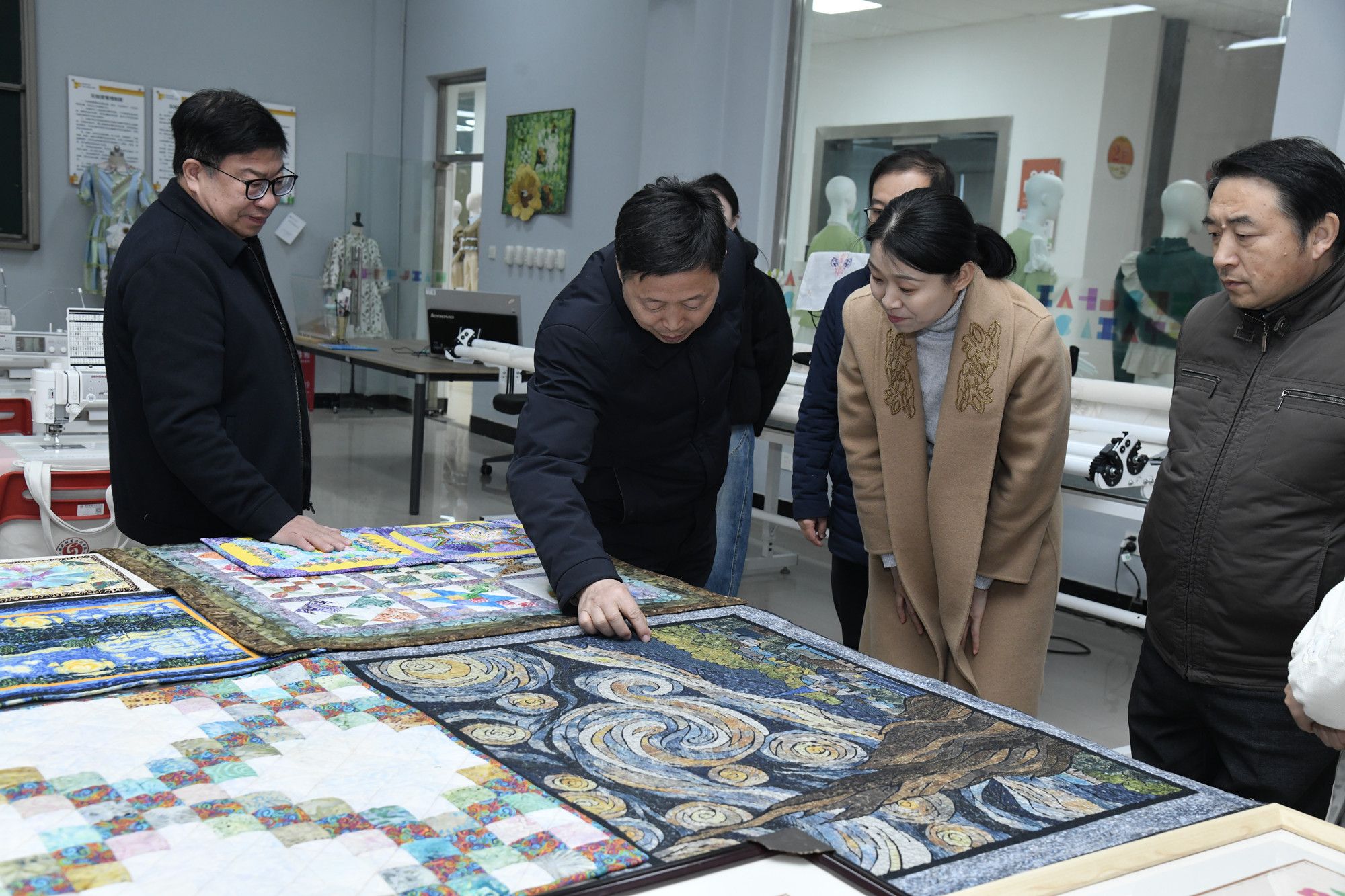 12月3日,省教科文卫体工会主席徐富权一行来我院考察验收指导赵丽娜拼布服装创新工作室,并召开座谈会进行交流。校党委书记王岗、工会主席刘明夫陪同考察。