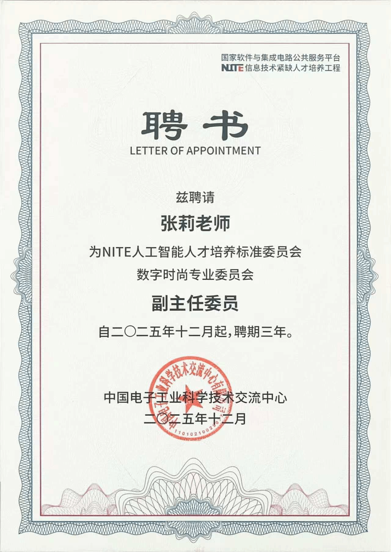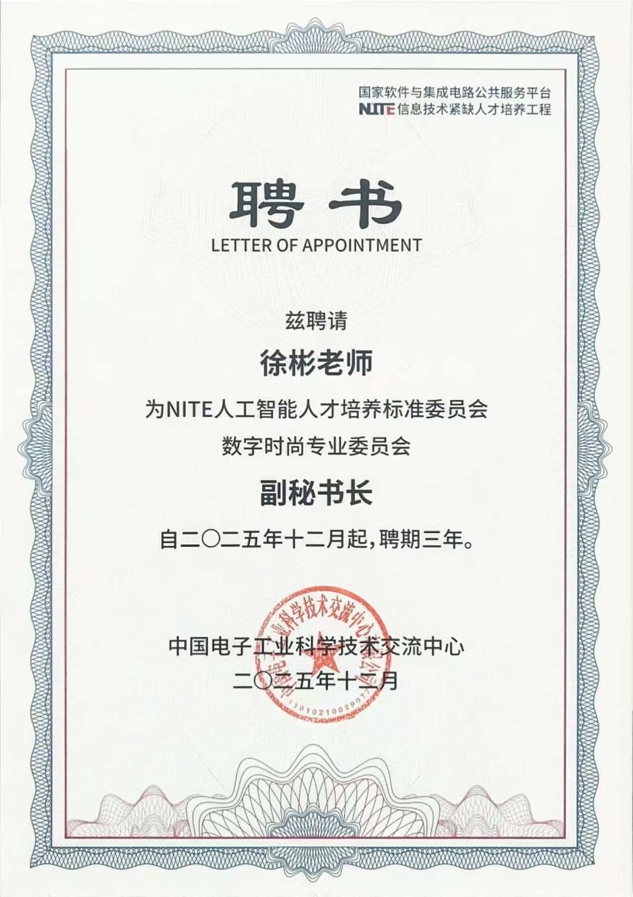 本次会议的关键议程之一是NITE人工智能人才培养标准委员会成立仪式,中国电子工业科学技术交流中心主任刘源超为委员代表颁发聘书。其中,服装学院院长张莉被正式聘任为该委员会数字时尚专业委员会副主任委员,服装学院执行院长徐彬被聘任为副秘书长。这一任命充分彰显了我院在数字时尚与人工智能融合领域的学科实力与行业影响力,标志着我院相关领域的工作获得行业权威认可。