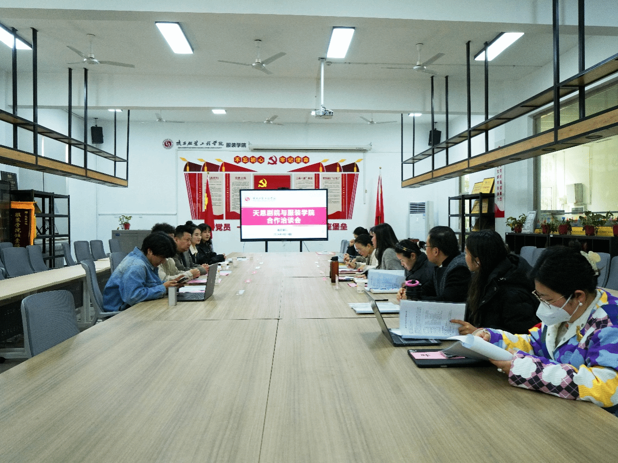 陕西中太天恩剧院团长魏雷、副团长杨浩、陈夷飞,AI运营部部长王博及行政办公室主任朱淼一行到访我校。我校服装学院科研院长刘红、学院党委书记李玉玫、办公室、实验室主任邵娟、表演系主任呼啸、服装与服饰设计系主任何沛、服装设计与工程系主任石晶玉,以及表演系教师吴博、王芳蕊、陈柏行和服装与服饰设计系教师晁雨晨共同出席本次洽谈会。