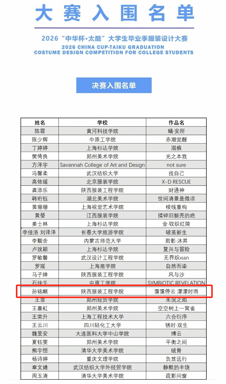 我校孙铭麒同学作品《霭霭停云 濛濛时雨》从2000余份稿件里崭露头角,经评审选出30名选手进入决赛,历经数轮考核,凭借兼具文化内涵和时尚表达的作品,赢得评审一致赞许,最终荣获铜奖。