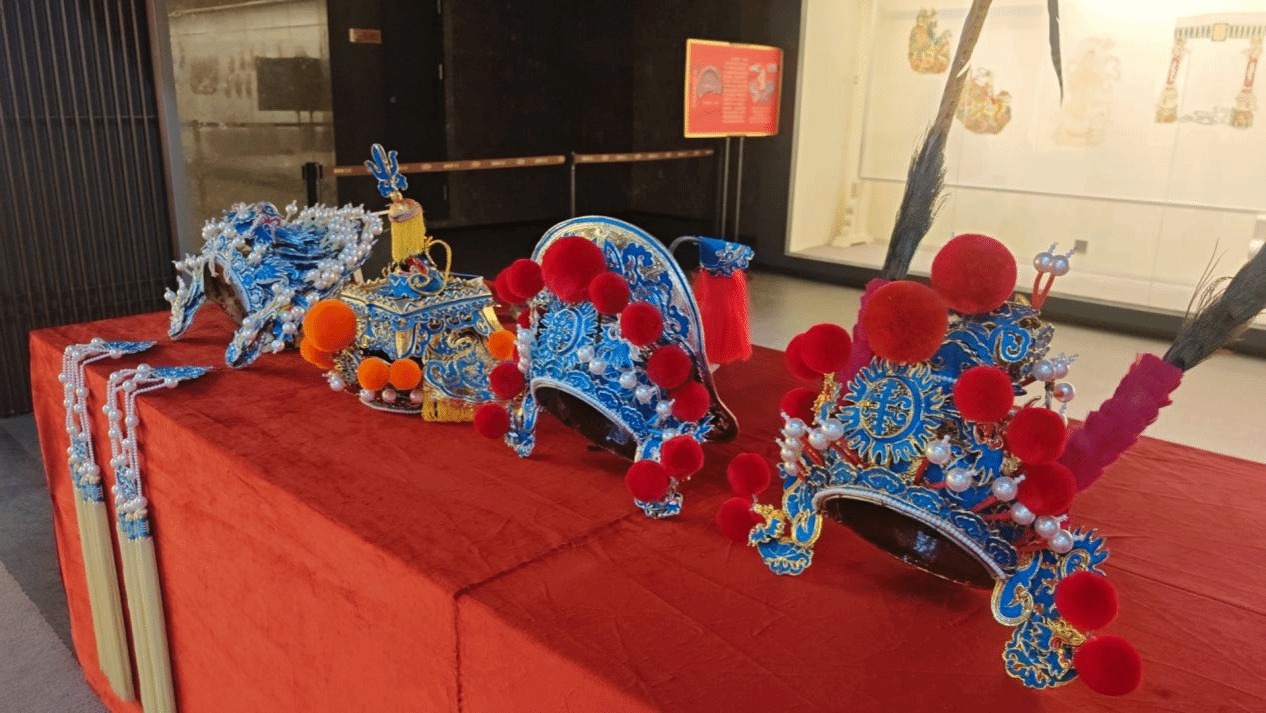 二楼“国剧正源艺术大成”展厅,成为本次地域文化艺术考察的核心看点。展厅内完整呈现秦腔生旦净丑行当的戏服、脸谱、化妆造型,板胡、梆子、锣鼓等全套伴奏乐器,以及秦腔“四大名旦”等名家蜡像与影像资料。同学们驻足观察,细致记录戏服的形制、纹样、色彩搭配与剪裁工艺,从领口、袖口、裙摆的细节设计,到头饰、配饰的搭配逻辑,逐一拆解秦腔服饰的艺术特征。“秦腔戏服的纹样与配色极具辨识度,红黑主调、对称纹样、宽袍大袖的形制,既彰显秦人豪迈气质,又蕴含传统服饰的审美智慧”。
