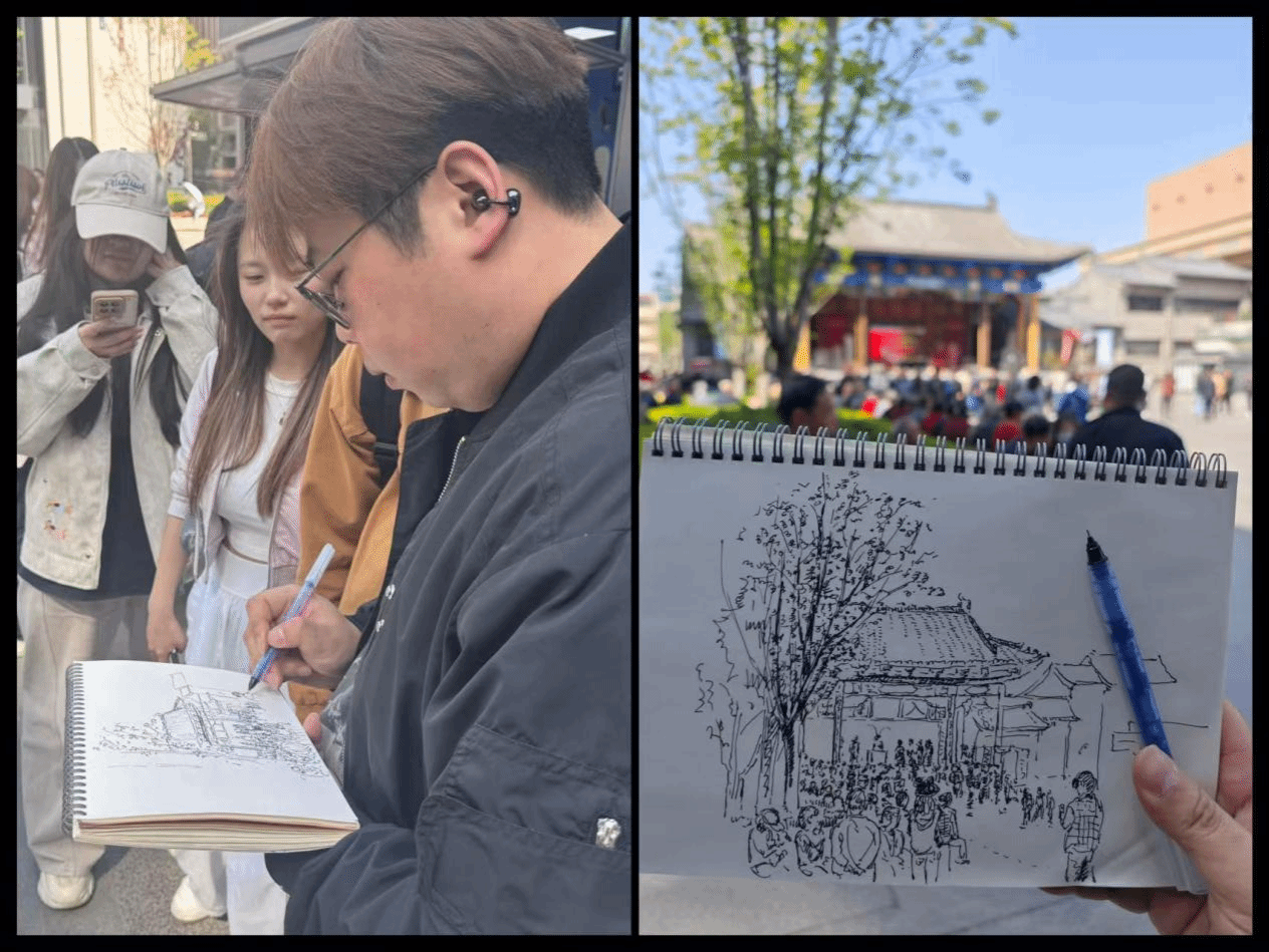 走出展厅,广场上一场原汁原味的秦腔露天表演正热闹开唱。身着经典戏服的演员粉墨登场,带队老师林承志现场拿起画笔进行速写示范,将舞台艺术的视觉张力转化为可应用的设计语言,让大家在实景与实操中深化对传统服饰美学的理解。