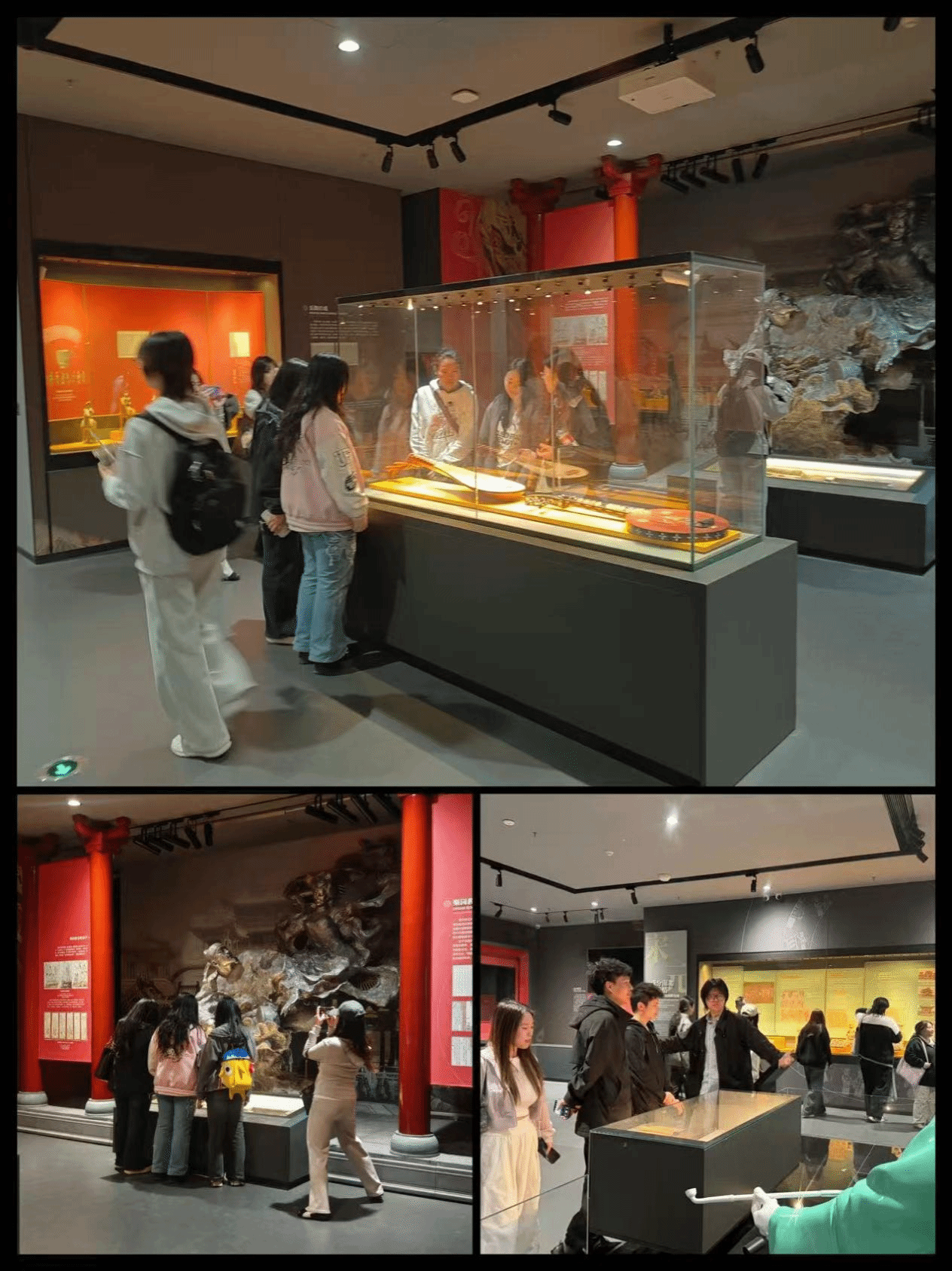 在一楼“大秦之腔华夏正声”展厅,新石器乐舞俑、演奏乐器、戏曲砖雕、古剧本刻本等珍贵文物静静陈列,直观展现秦腔与秦地文明的深厚渊源,让同学们深刻体会到“秦声”背后的历史厚重感。