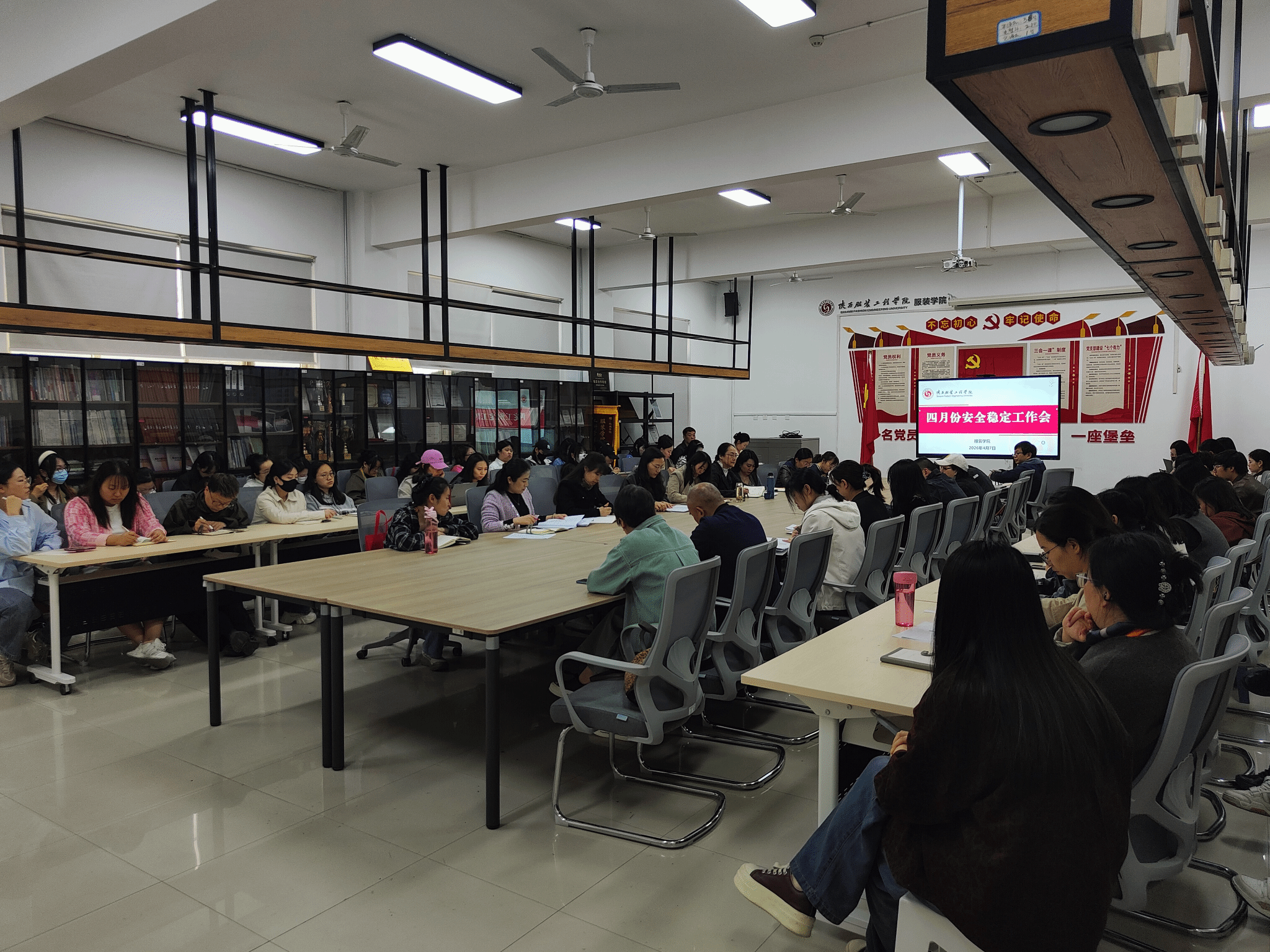 学院党委书记李玉玫传达了学校四月份安全稳定工作会议的核心要求,结合节假日学生踏青出游增多、春季学生心理问题高发等阶段性特点,围绕六大重点领域对学院安全工作进行细化部署。