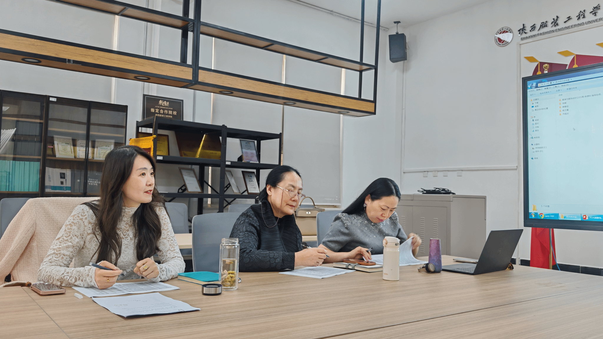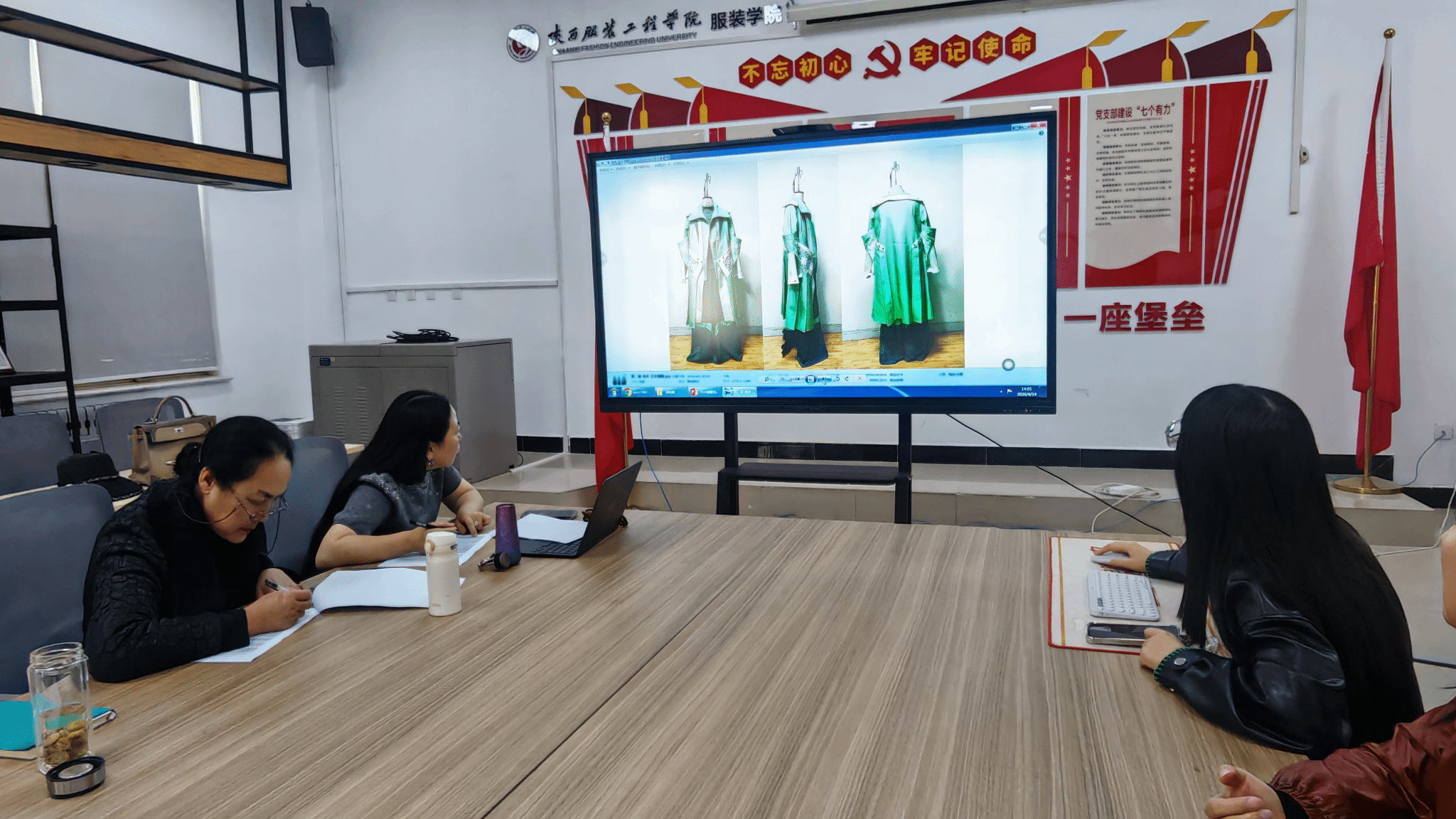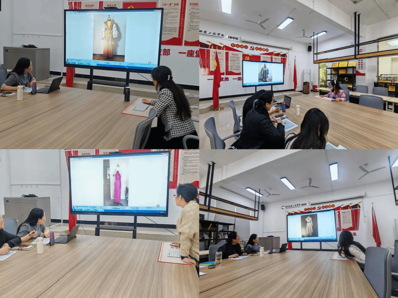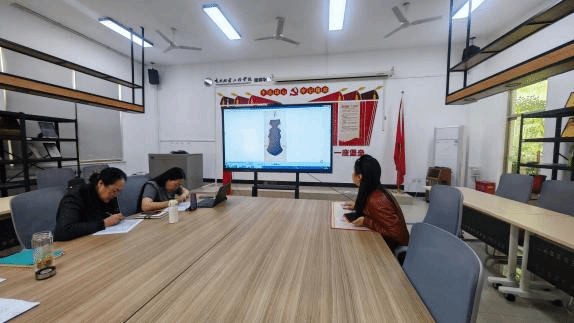 汇报现场,各位指导老师依次汇报了本组学生毕业设计的进度,详细介绍了学生作品的修改完善情况,涵盖设计效果图、成衣样品、工艺说明等完整成果的完成进度,并清晰地阐述了学生的设计思路、文化融入、市场调研、工艺实现以及优化过程。